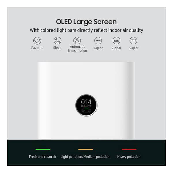 نمایشگر دستگاه اطلاعاتی در خصوص کیفیت هوای محیط را ارائه میدهد. کاربر میتواند در هر لحظه مقادیر مربوط به ذرات PM2.5 و PM10 را مشاهده کند. در قسمت پایینی نمایشگر دو دکمه لمسی برای کنترل تنظیمات دستگاه تعبیه شده است که به راحتی میتوانید از آنها استفاده کنید. وضعیت هوای محیط با استفاده از یک نوار رنگی نمایش داده میشود. رنگ سبز، زرد، نارنجی و قرمز به ترتیب نشان دهنده هوای تمیز و با کیفیت، آلودگی کم، آلودگی متوسط و آلودگی زیاد است.