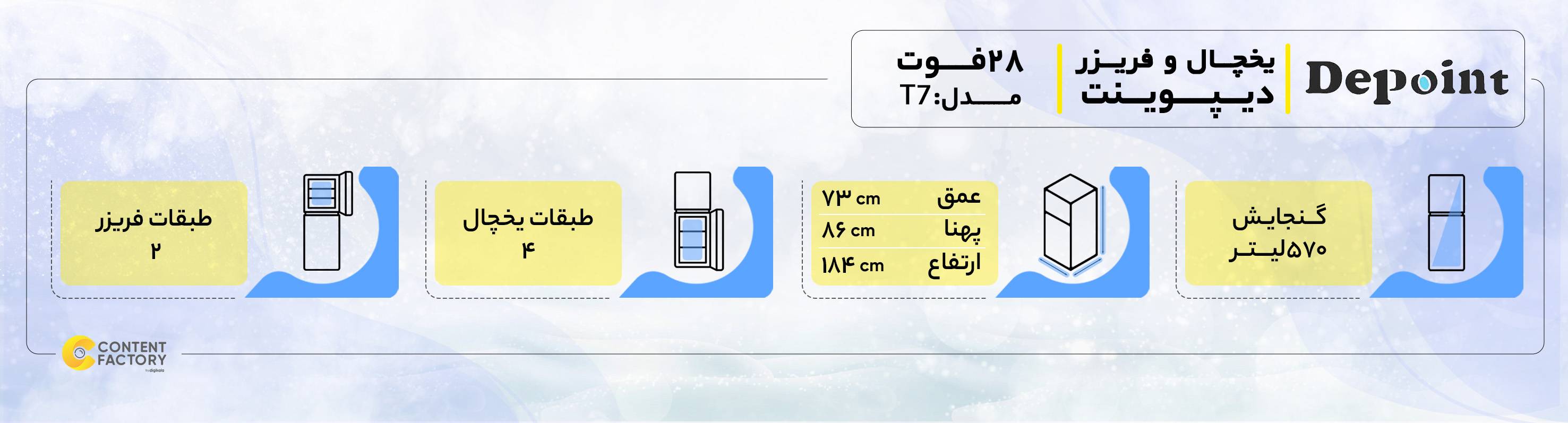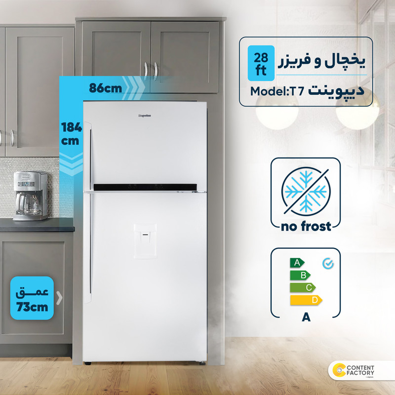 یخچال و فریزر 28 فوت دیپوینت مدل T7 دارای ارتفاع 184 سانتیمتر و عمق 73 سانتیمتر و پهنای 86 سانتیمتر است. ظرفیت 570 لیتری این محصول استفاده از آن را برای خانوادههای متوسط و کم جمعیت مناسب کردهاست. از این 570 لیتر، حدود 148 لیتر ویژه فریزر و 422 لیتر مخصوص یخچال است. این یخچال با توان مصرفی کم و عملکرد بهینه در گرید A قرار دارد. میزان مصرف انرژی این یخچال در مدت زمان یک سال بسیار کمتر از یخچالهای دیگر است و به این دلیل میتوان آن را به عنوان یک انتخاب هوشمندانه برای مصرفکنندگان توصیه کرد. همچنین، یخچال و فریزر 28 فوت دیپوینت مدل T7مجهز به تکنولوژیهای پیشرفتهای است که کاهش صدا و لرزش را به حداقل میرساند. با استفاده از این یخچال، میتوانید به صورت مطلوبی غذاها و نوشیدنیهای خود را نگهداری کنید و به صورت بهینه انرژی مصرف کنید. به طور کلی، یخچال و فریزر 28 فوت دیپوینت مدل T7در گرید A یک گزینه عالی برای صرفه جویی در مصرف انرژی است.