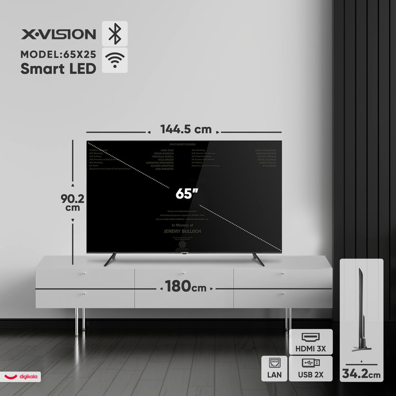 تلویزیون ۶۵ اینچ ال ای دی هوشمند ایکس ویژن مدل 65X25 با طراحی صفحه تخت و گرید انرژی B، گزینهای پیشرفته برای افرادی است که ترکیبی از کیفیت تصویر بالا و امکانات هوشمند را بهدنبال دارند. این محصول از تکنولوژی صفحه نمایش QLED بهره میبرد که در کنار پنل IPS Level Panel، رنگهایی زنده، شفافیت فوقالعاده و زاویه دید گسترده ۱۷۶ درجه را ارائه میدهد. رزولوشن ۳۸۴۰×۲۱۶۰ پیکسل با نسبت تصویر ۱۶:۹ و کیفیت ۴K باعث نمایش جزئیات دقیق و واقعی میشود. نرخ تازهسازی تصویر ۶۰ هرتز، روشنایی ۳۶۰ نیت، نسبت کنتراست ۱۵۰۰ و زمان پاسخدهی سریع ۸ میلیثانیه تجربهای روان و بدون تاری از محتوای ویدئویی را تضمین میکنند. همچنین پشتیبانی از فرمتهای HDR10، نمایش محتوای دارای دامنه دینامیکی بالا را امکانپذیر ساخته است. بخش صدای این تلویزیون با توان خروجی کلی ۲۴ وات و فناوری پیشرفته Dolby Atmos، صدایی فراگیر، عمیق و کاملاً هماهنگ با تصویر ارائه میدهد. این ویژگی باعث میشود کاربر هنگام تماشای فیلم یا بازی حس حضور در صحنه را تجربه کند. از نظر اتصالات، تلویزیون مجهز به ۳ پورت HDMI 2.0، ۲ پورت USB 2.0، پورت شبکه LAN، جک ۳.۵ میلیمتری صدا، ورودی آنتن و یک رابط کامپوزیت است. گیرنده دیجیتال داخلی DVB-T2 نیز امکان دریافت مستقیم کانالهای تلویزیونی را بدون نیاز به تجهیزات جانبی فراهم میکند. قابلیتهای هوشمند این مدل با سیستمعامل Android و حافظه داخلی ۱۶ گیگابایت شامل اتصال به اینترنت، منوی فارسی، پشتیبانی از زیرنویس فارسی، مرورگر وب، ضبط برنامه (PVR)، قابلیت Time Shift، تلهتکست، جدول پخش برنامه و خاموش شدن خودکار است. پردازنده چهار هستهای آن اجرای سریع و بیوقفه برنامهها و بازیها را تضمین میکند. از نظر طراحی، ابعاد دستگاه با پایه ۱۴۴۵x۹۰۲x۳۴۲ میلیمتر و بدون پایه ۱۴۴۵x۸۳۷x۹۸ میلیمتر است. وزن آن با پایه ۱۸.۹ کیلوگرم و بدون پایه ۱۸.۲ کیلوگرم بوده و پایهها به شکل دو شاخه طراحی شدهاند. امکان نصب روی دیوار نیز بهمنظور استفاده بهینه از فضا وجود دارد. همراه دستگاه، ریموت کنترل و دفترچه راهنما ارائه میشود. تلویزیون 65X25 ایکس ویژن با ترکیب تصویر درخشان، صدای قدرتمند و امکانات هوشمند کامل، انتخابی ممتاز برای تجربه سینمای خانگی و سرگرمیهای چندرسانهای محسوب میشود.