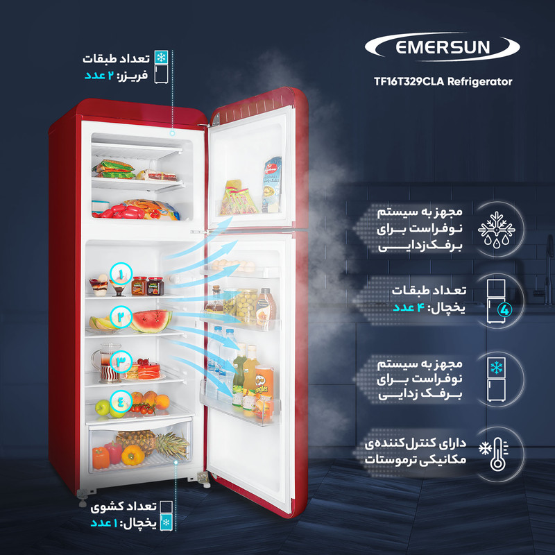 امرسان برندی مطرح با طرحهای زیبا و کاربردی است که تنوع محصول بالایی دارد. تا حالا به این فکر کردهاید که یخچال رنگی خود را با فضای آشپزخانه خود هماهنگ کنید؟ این موضوع نیز از چشم امرسان دور نمانده و تنوع رنگ بالای آن مثالزدنی است. یخچال امرسان مدل TF16T329CLA محصولی جمعوجور و کاربردی است که انتخابی ایدهآل برای زوجهای جوان و خانوادههای کمجمعیت است. نمودار مصرف انرژی ++A نقطه قوت این محصول بهشمار رفته و این محصول را در دستهی کممصرفترین محصولات قرار میدهد. یخچال امرسان مدل TF16T329CLA 4 طبقه داشته و فضای مناسبی در اختیار کاربر قرار میدهد. فضای فریزر زیاد نبوده و حداقل فضای مورد نیاز را فرآهم کرده است. طبقات شیشهای نشکن خیال شما را راحت کرده و نگران شکستن طبقات یخچال نباشید. کشویی جدا برای قرار دادن میوه و سبزی تعبیه شده تا با دیگر مواد داخل یخچال قاطی نشود و در فضای اختصاصی قرار گیرد.