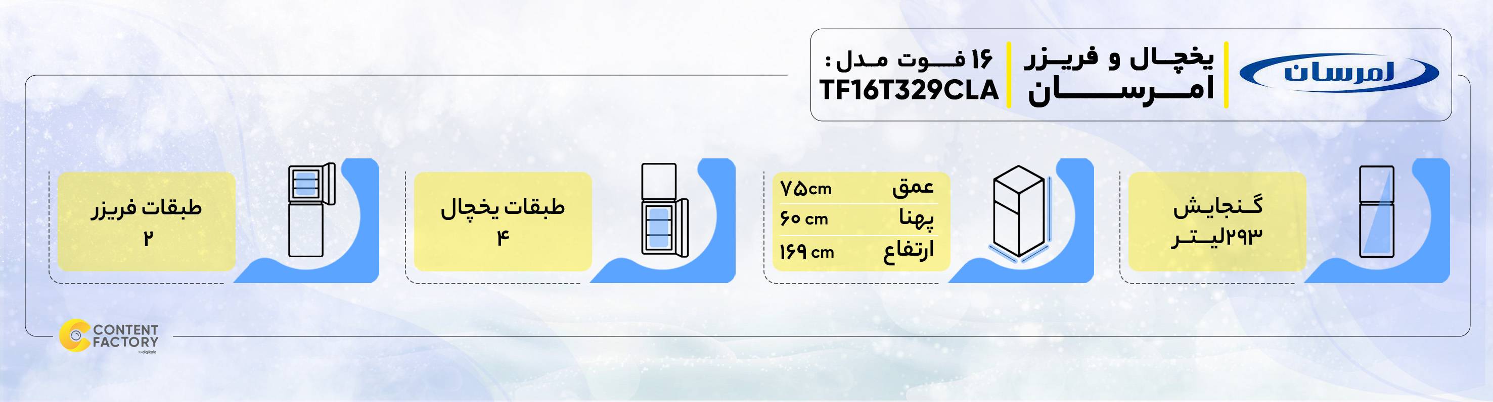 این محصول امرسان دارای چهار طبقهی داخلی است و همه طبقات قابل تنظیم است، بهطوریکه میتوان آن را در شیارهای ازپیشتعیینشده در بدنهی یخچال، تنظیم کرد. یک صندوق پلاستیکی نیز در پایینترین قسمت یخچال در نظر گرفته شده است که میتوان میوه یا کیسههای محتوی مواد مختلف را در آنها قرار داد. یخچال مدل TF16T329CLA دارای محفظههای مختلف روی در است که از آنها میتوان برای نگهداری بطریهای کوچک و بزرگ، کره، پنیر، تخممرغ و ... استفاده کرد. البته باید توجه داشت که در نباید زیاد سنگین شود.