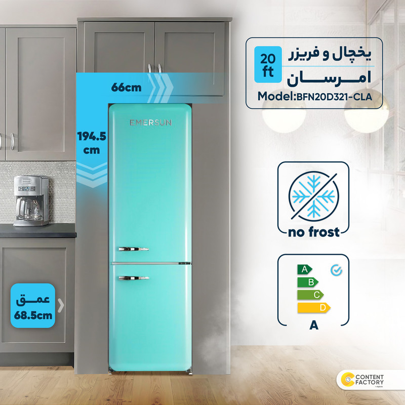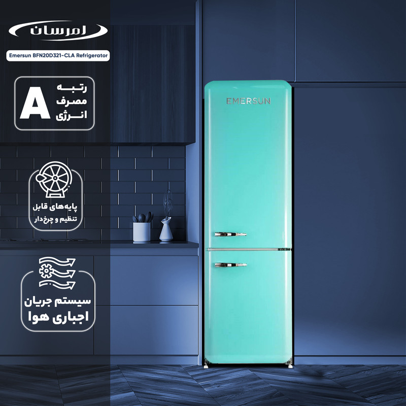 یخچال و فریزر مدل BFN20D321-CLA محصولی از یخچال و فریزرهای شرکت «امرسان » (Emersun) است. طراحی این یخچال و فریزر در عین سادگی جلوه زیبایی دارد. یخچال فریزر امرسان، 307 لیتر ظرفیت مفید دارد که 230 لیتر ظرفیت یخچال و 77 لیتر هم ظرفیت مفید فریزر است. فضای داخلی یخچال با استفاده از شیشهی نشکن به 4 طبقه تقسیم شدهاست.ارتفاع هر بین طبقات براساس میانگین ابعاد استاندارد ظروف انتخاب شدهاست. برای استفادهی حداکثری از فضای بین طبقات، ارتفاع هر طبقه به طور مجزا هم قابل تنظیم است. این مدل دارای برچسب مصرف انرژی A است که میتواند در کلهش هزینههای انرژی خانواده تاثیر گذار باشد. همچنین سیستم سرمایش این دستگاه تماما از نوع بدون برفک است. این سیستم برفکهای یخچال فریزر را به صورت خودکار آب میکنند. وجود برفک باعث افت کیفیت عملکرد یخچال و در نتیجه افزایش مصرف انرژی میشود. طراحی ساده و کلاسیک این محصول، علاوه بر هماهنگی با انواع دکوراسیونها، یادآور خاطرهی زیبای گذشتهها است.
