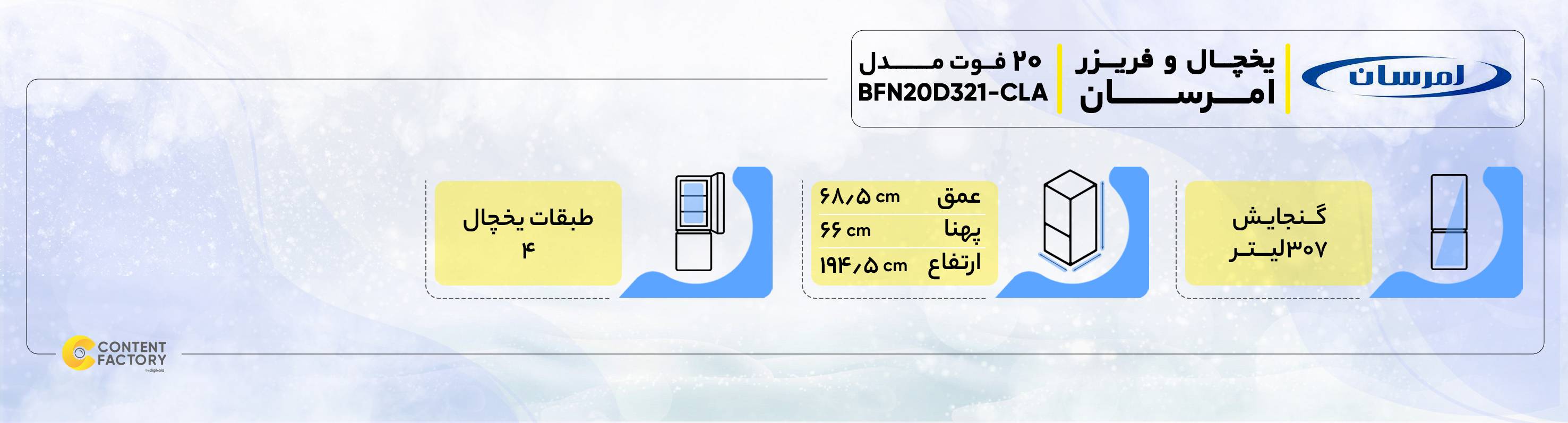 یخچال و فریزر 20 فوت امرسان مدل BFN20D321-CLA در دسته یخچال فریزرهای بالا و پایین قرار دارد که یخچال در بخش بالایی و فریزر در زیر آن تعبیه شدهاست. این محصول دارای طراحی مینیمال بدون هیچ گونه آیتم اضافی بر روی بدنه است. ظاهری کشیده همراه با دستگیرههای استیل در انتهای درب یخچال و در ابتدای درب فریزر دارد که در فصل مشترک یخچال و فریزر به یکدیگر رسیدهاند. 4 طبقه در یخچال همراه با یک کشو و سه کشو جادار در بخش فریزر طراحی داخلی یخچال و فریزر 20 فوت امرسان مدل BFN20D321-CLA را تشکیل میدهد. کلیه طبقات و کشوهای این محصول از شیشه نشکن و شفاف ساخته شده که میتوانند وزن زیاد را نیز تحمل کنند. این طبقات دارای قابلیت تنظیم ارتفاع هستند بنابراین شما میتوانید متناسب با ابعاد لوازم خوراکی خود، ارتفاع طبقات را کم یا زیاد کنید. بر روی درب یخچال و فریزر نیز طبقاتی تعبیه شده که شما میتوانید جهت قرار دادن انواع بطری، شیشه مربا، نوشابه و سایر مواد منجمد کوچک از آنها استفاده کنید. این یخچال بر روی پایههای چرخدار قرار دارد که جابهجایی آن را بسیار آسان کرده و مانع از تماس مستقیم کف آن با سطح آشپزخانه و پوسیدگی بر اثر رطوبت میشود. یخچال و فریزر 20 فوت امرسان مدل BFN20D321-CLAدارای ارتفاع ۱۹۴.۵ سانتیمتر،عمق ۶۸.۵ سانتیمتر و پهنای 66 سانتیمتر است. ظرفیت 307 لیتری این محصول پاسخگوی تمامی نیازهای یک خانواده دو نفره و سه نفره است.